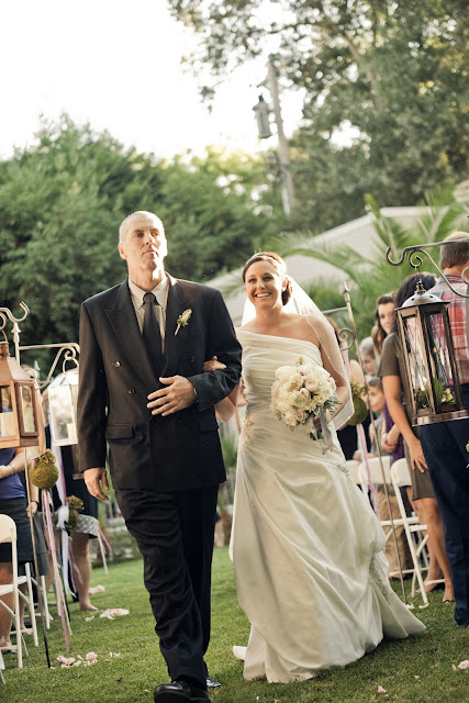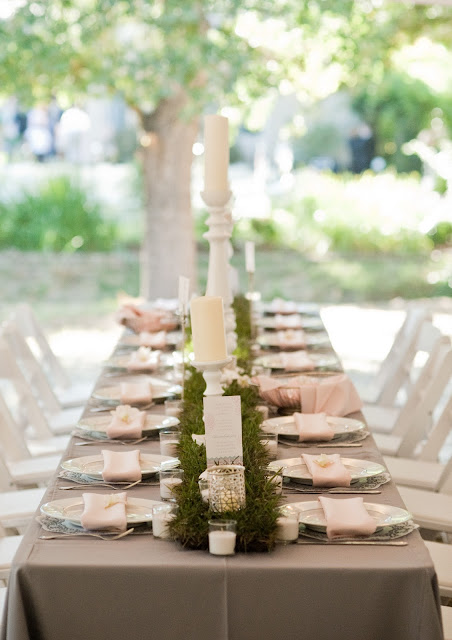 Romantic tablescapes with a chic vintage feel for the 130 guests became a design collaboration between KME and East Sac Florist. Grey linens, pink napkins and white dinnerware set the stage for the grand centerpieces of live grass that acted as table runners. To make sure we had the romantic lighting the couple desired, we used plenty of candles on white pillars of different sizes along with silver votive holders. The 4-tiered chocolate cake placed under a large oak tree strewn with hanging lanterns was covered in white fondant and embellished with pink handmade fondant bows, brooches and fresh flowers. Guests dined on fresh Mexican food and sipped on margaritas, then danced the night away along with the happy couple.