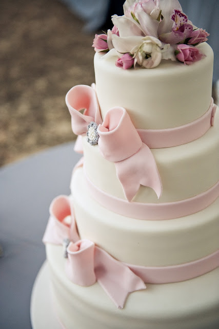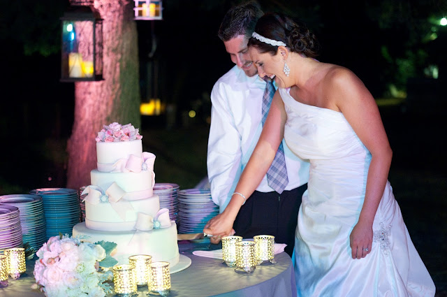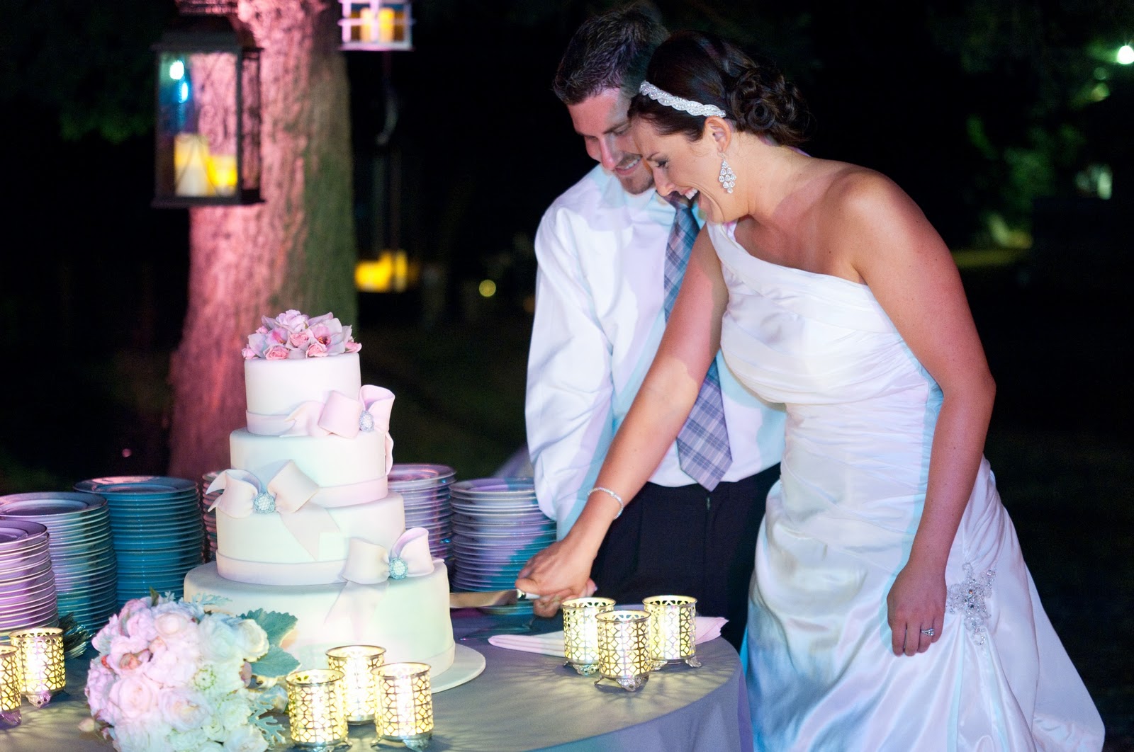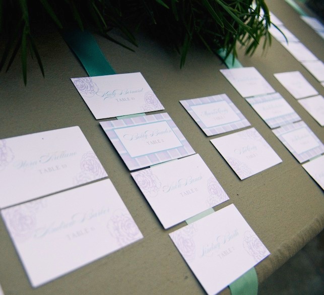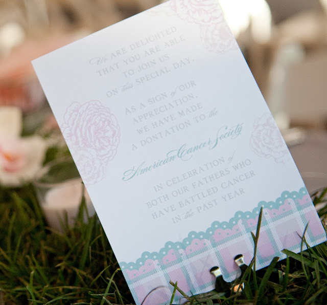 The outdoor ceremony and reception took place at a beautiful private estate. Lauren wanted an elegant, romantic look with a soft color palette and lots of beautiful flowers. Their custom stationery and signage designed by KME Paperie included a pink and teal plaid design with scalloped eyelet detailing and accented with rose illustrations to flatter the scripted calligraphy.