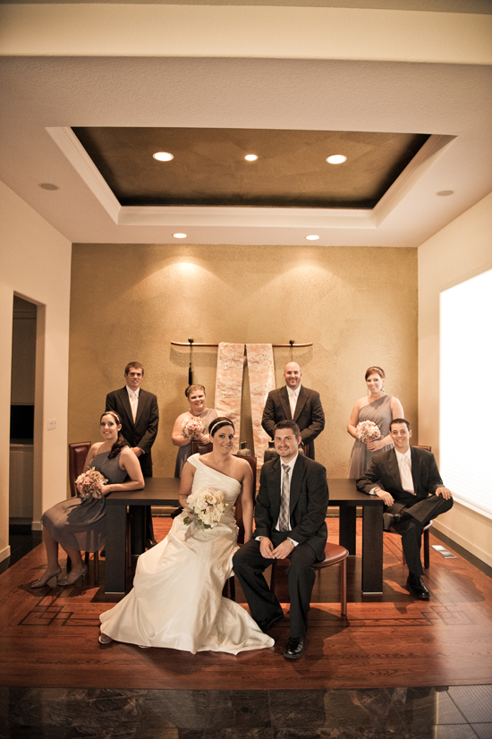 The romantic florals by Philip of East Sac Florist in creamy whites and dusty pinks and lavender included peonies, roses, hyacinth, dahlias, and dusty miller and were wrapped in silver satin ribbon. The bridal party wore draped, one-shoulder grey chiffon dresses that mimicked the brides’ embellished, off-the-shoulder, pleated taffeta gown. The groomsmen were attired in dark suits with light pink ties, except for the groom whose plaid tie matched the stationery.